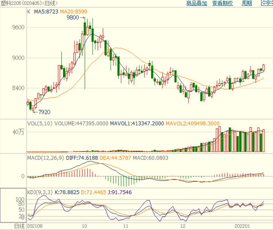 国内PE新增大修装置减少,部分检修装置计划开车,下游需求表现一般:棚膜生产旺季基本结束,地膜生产旺季尚未启动,尤其是下游工厂陆续放假,库存有上升风险,国际油价涨至前高附近,一旦回调,可能拖累PE现货走跌,仅供参考。