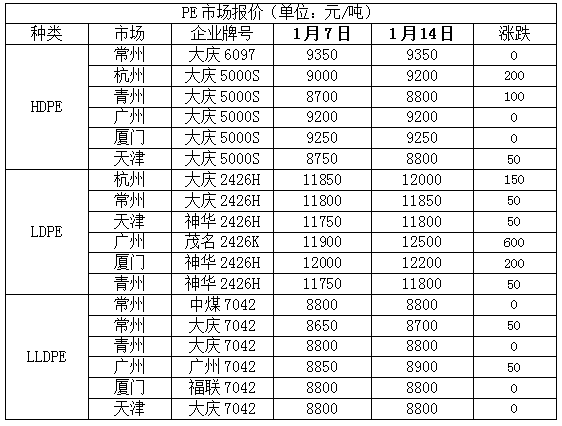本周现货市场报价上涨50-200,国际原油期货大涨,成本支撑偏强,PE出厂价部分调涨,塑料期货大涨刺激买家购买积极性,支撑贸易商高报出货,不过PE下游整体需求表现一般,现货市场高价成交气氛一般。