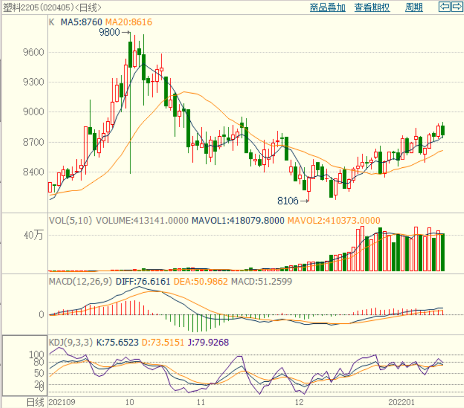 塑料期货05合约震荡下,KDJ指标拐头向下,MACD上涨红柱变短,持仓量减少,成交量下降,国际油价上涨,成本支撑增强,不过国内PE供应预期上升,下游1月15后以后陆续放假,下游需求预期转弱,现货反弹有限,基差缩窄,抑制期货涨幅,仅供参考。