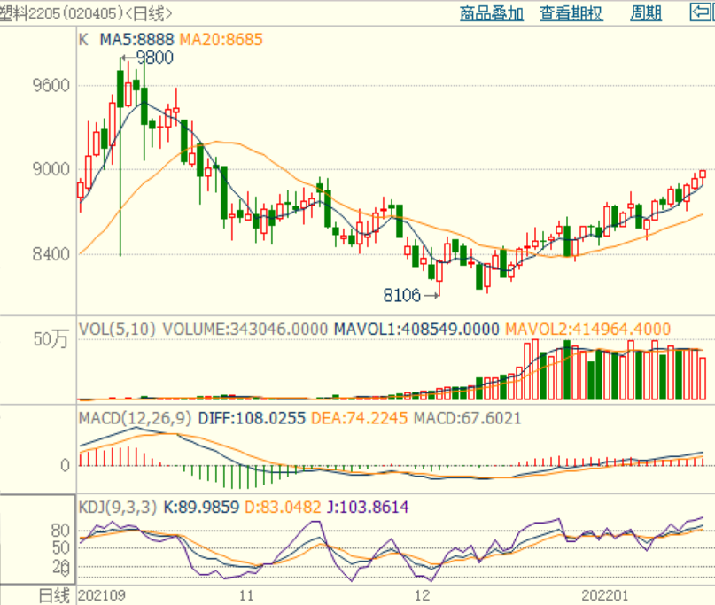 塑料期货05合约涨幅缩窄,KDJ指标超买,拐头向下,MACD上涨红柱变短,持仓量下降,成交量增加,国内PE供应预期上升,下游工厂陆续放假,下游需求预期转弱,现货反弹有限,尤其是国际油价盘中回调,成本支撑下降,抑制期货涨幅,仅供参考。