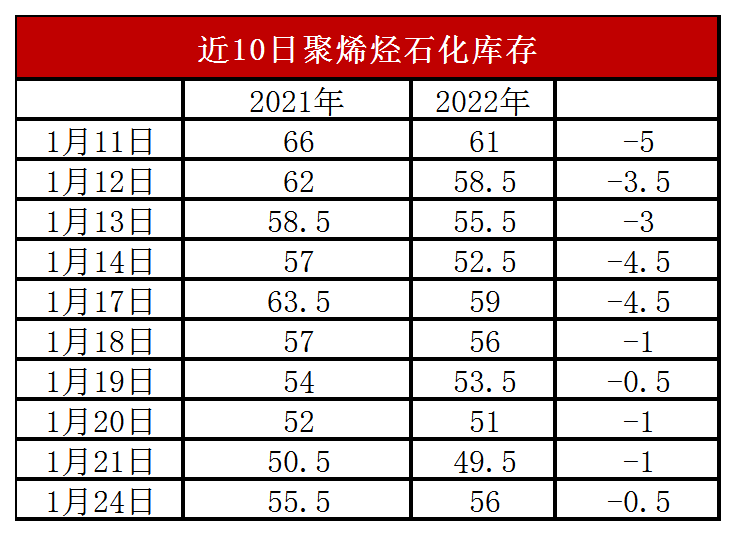 周初石化库存56万吨,较上周末增加6.5万吨,基本与去年同期持平。前期石化快速去库主要得益于节前下游赶制订单以及节前备货,不过随着春节临近,华东及华南地区部分下游面临放假,华北地区虽然放假较晚,但是下月面临冬奥会环保限产,后期需求整体趋弱,石化库存继续下降空间有限,春节期间将进入累库周期。