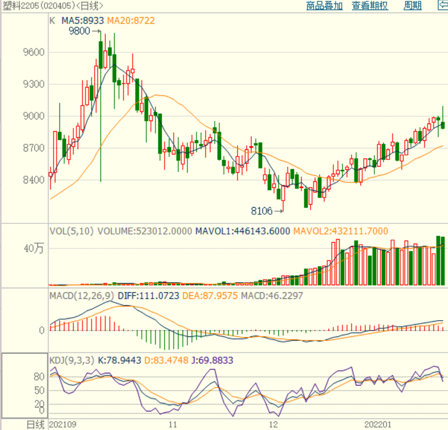 塑料期货05合约震荡下跌,KDJ指标拐头向下,MACD上涨红柱变短,持仓量及成交量下降,国内PE供应预期上升,下游工厂陆续放假,下游需求预期转弱,现货反弹有限,尤其是国际原油及动力煤期货下跌,成本支撑下降,预计塑料期货仍有调整风险,仅供参考。