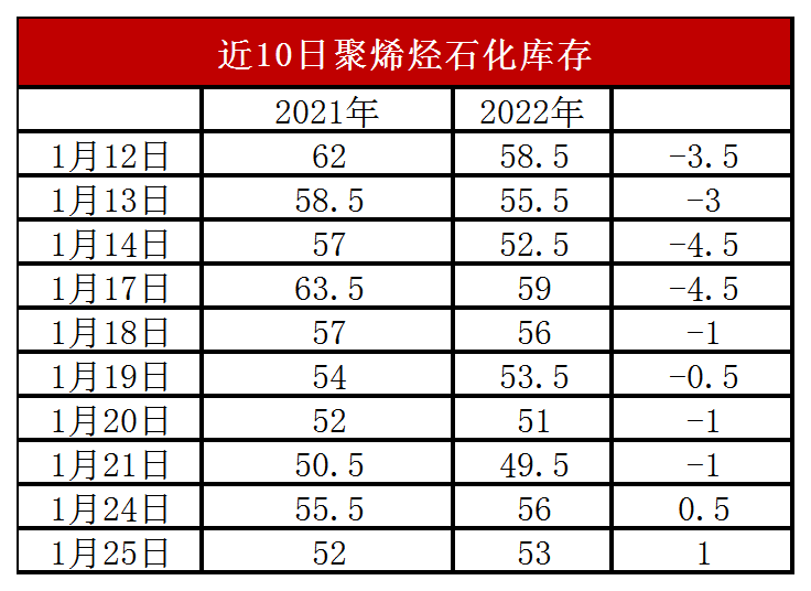 周二石化库存53万吨,较昨天下降3吨,基本与去年同期持平。前期石化快速去库主要得益于节前下游赶制订单以及节前备货,不过随着春节临近,华东及华南地区部分下游面临放假,华北地区虽然放假较晚,但是下月面临冬奥会环保限产,后期需求整体趋弱,石化库存继续下降空间有限,春节期间将进入累库周期。