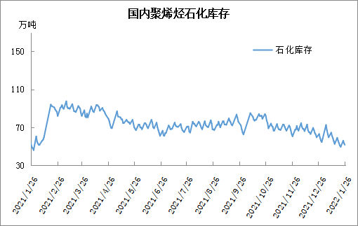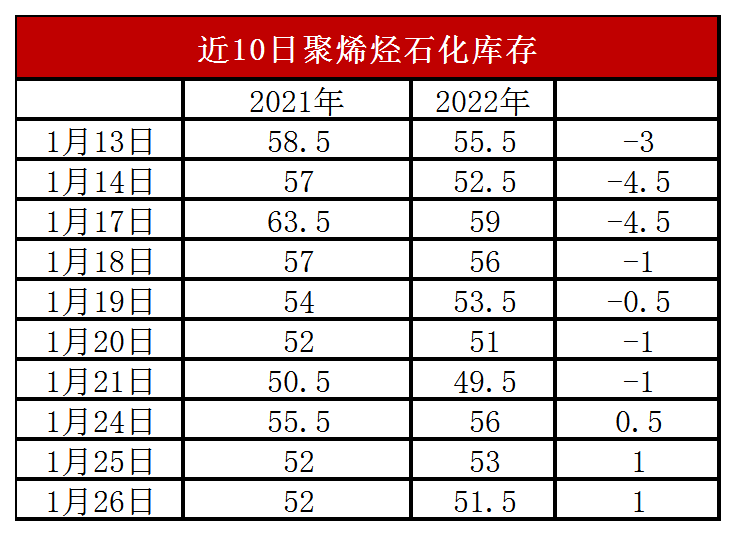 周三石化库存51.5万吨,较昨天下降1.5吨,基本与去年同期持平。前期石化快速去库主要得益于节前下游赶制订单以及节前备货,不过随着春节临近,华东及华南地区部分下游面临放假,华北地区虽然放假较晚,但是下月面临冬奥会环保限产,后期需求整体趋弱,石化库存继续下降空间有限,春节期间将进入累库周期。