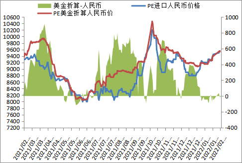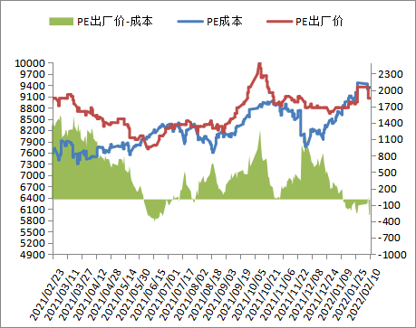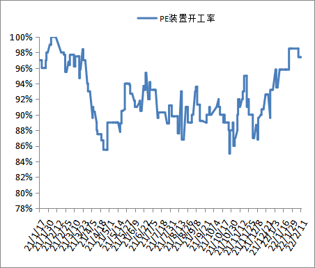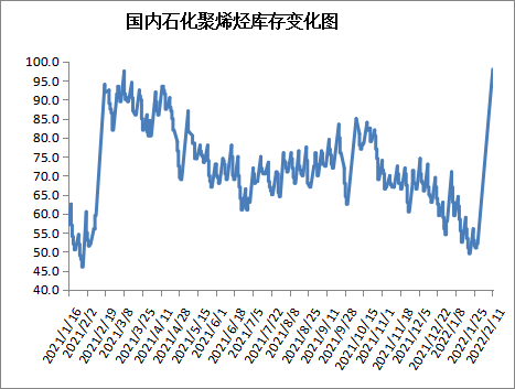 截至2月11日石化聚烯烃库存在98万吨,较春节假期前增加46万吨,国内PE开工负荷维持高位,虽然进口货源冲击压力偏轻,但是下游需求偏弱,春节假期大幅累库。