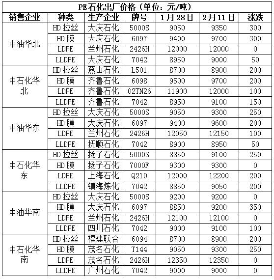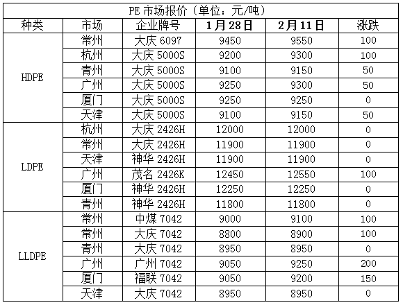 春节假期后现货市场报价较春节假期前上涨50-200,国际原油及塑料期货重心上移,支撑PE出厂价部分调涨,刺激买家购买积极性,支撑贸易商高报出货,不过下游工厂需求偏弱,尤其是国际油价回落导致塑料期货大跌,打压现货市场报价下跌,市场成交气氛转弱。