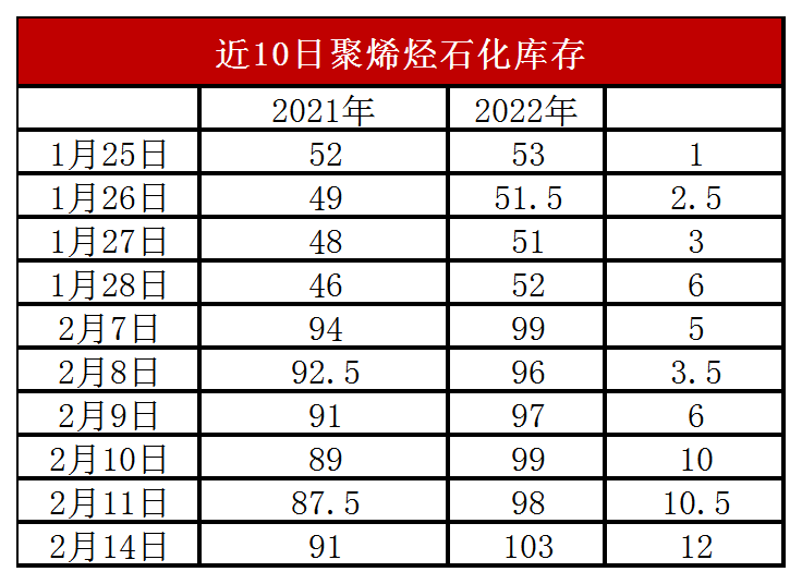 周初石化库存103万吨,较上周末增加5万吨,较去年同期高12万吨。春节之后PP出现错配,需求不及节前,但是供应压力增大,开工率突破90%大关,供需错配之下石化库存突破100万吨大关,远高于去年同期,且社会库存居高不下。不过下游库存偏低,随着需求逐渐恢复,下游有一定补库空间,一定程度上有望缓解库存压力。