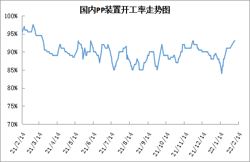 春节期间PP生产企业多数维持正常开工,节后初期PP开工率仍在90%以上,目前已经涨至阶段性高点93%附近,且短期内暂无较多检修计划,预计高开工率继续维持,加之后期新装置面临投产,供应端偏利空。