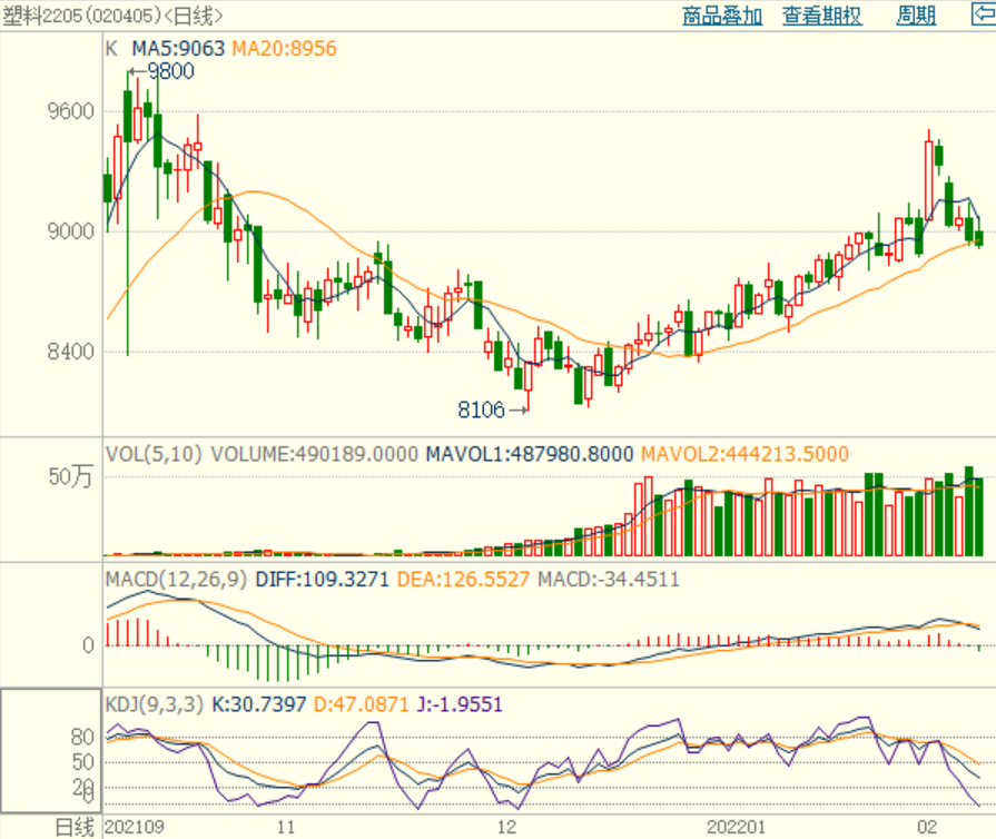 塑料期货05合约延续下跌行情,KDJ指标向下扩散,MACD下跌绿柱变长,持仓量及成交量下降,国内PE检修偏少,元宵节前下游需求偏弱,尤其是动力煤期货走弱,成本支撑下降,预计塑料期货仍有回调风险,仅供参考。