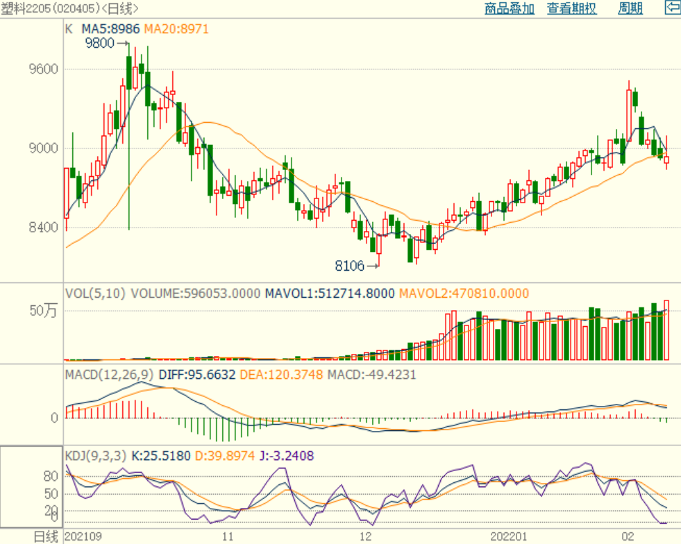 塑料期货05合约冲高回落,KDJ指标跌势放缓,MACD下跌绿柱变长,持仓量及成交量增加,国内PE检修偏少,下游需求启动缓慢,尤其是动力煤期货走弱,成本支撑下降,预计塑料期货仍有回调风险,仅供参考。