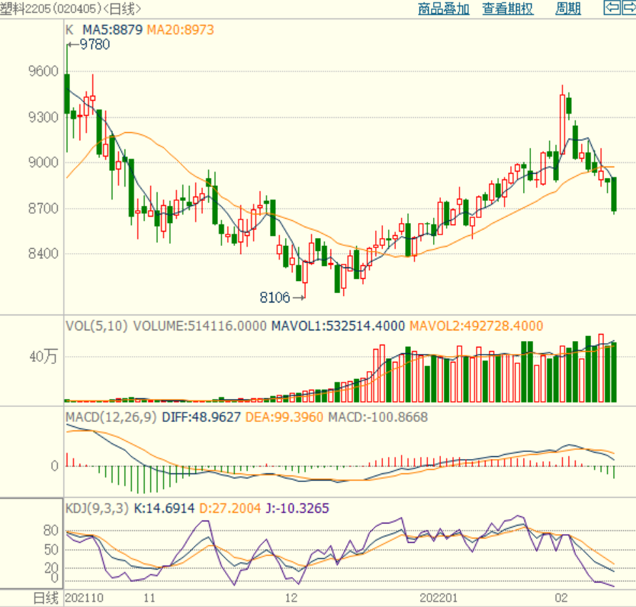 塑料期货05合约延续下跌行情,KDJ指标继续向下发散,MACD下跌绿柱变长,持仓量及成交量上升,国内PE检修偏少,下游需求启动缓慢,不过国际油价维持高位,油制LL利润亏损,抑制期货跌幅,仅供参考。