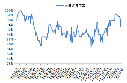 石化检修涉及产能维持180万吨左右,开工负荷维持93.3%左右,石化日产量维持7.05万吨左右。其中130万吨检修产能计划本周开车,不过传闻由于利润亏损,后期中石化PE装置负荷意向下调。