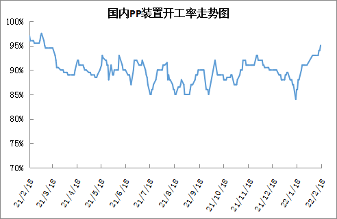 春节过后PP检修装置减少,开工率突破90%以上,本周PP检修装置继续减少,开工率目前已经达到95%附近的绝对值高点。虽然PP供应压力较大,但是传闻上游企业亏损明显后期有降幅保价意向,若能兑现,将有望改善供需矛盾。