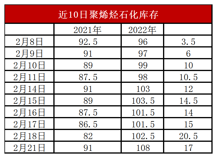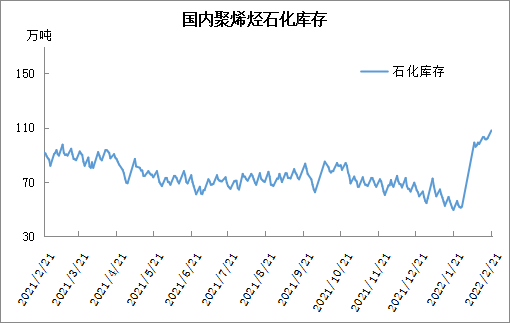 周一石化库存108万吨,较上周末增加5.5吨,较去年同期高17万吨。虽然节后需求陆续恢复,但是冬奥会及冬残奥会对北方地区部分下游限制,需求不及节前水平,但是聚烯烃开工率维持90%以上高位且新装置投产,供应增加需求减弱,供需错配并未有效改善,近期库存或居高不下,但是后期需求有改善预期,如果传闻的石化限产保价夯实,石化有望缓解库存,否则去库难度依然较大。
