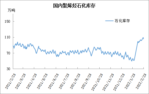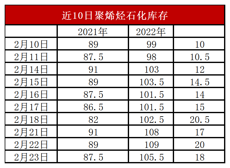 周三石化库存105.5万吨,较昨天下降3.5吨,较去年同期高18万吨。春节过后聚烯烃多数时间供需错配,不过近期多数需求恢复,需求逐渐改善,石化系统也有降幅保价意向,且开始执行批量优惠,石化去库提速,近期首次出现降负迹象,预计近期有望持续降库。