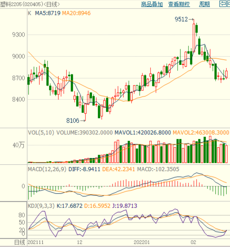 塑料期货05合约震荡反弹,持仓量上升,成交量下降,国际原油大涨,油制LL利润亏损较多,成本支撑较强,不过下游需求恢复缓慢,PE两油及煤化工库存偏高并且消化缓慢,抑制期货涨幅,重点关注原油及PE库存变化,仅供参考。