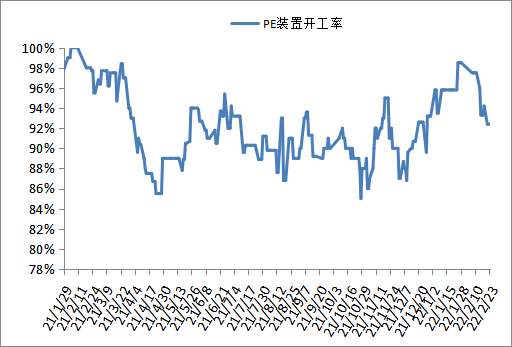 国内PE检修涉及产能在210万吨左右,开工负荷在92.4%左右,日产量在7万吨左右,PE开工负荷虽有下降,但是仍处于偏高水平。国内PE新增大修装置偏少,其中120万吨非计划性检修装置计划2月底开车。