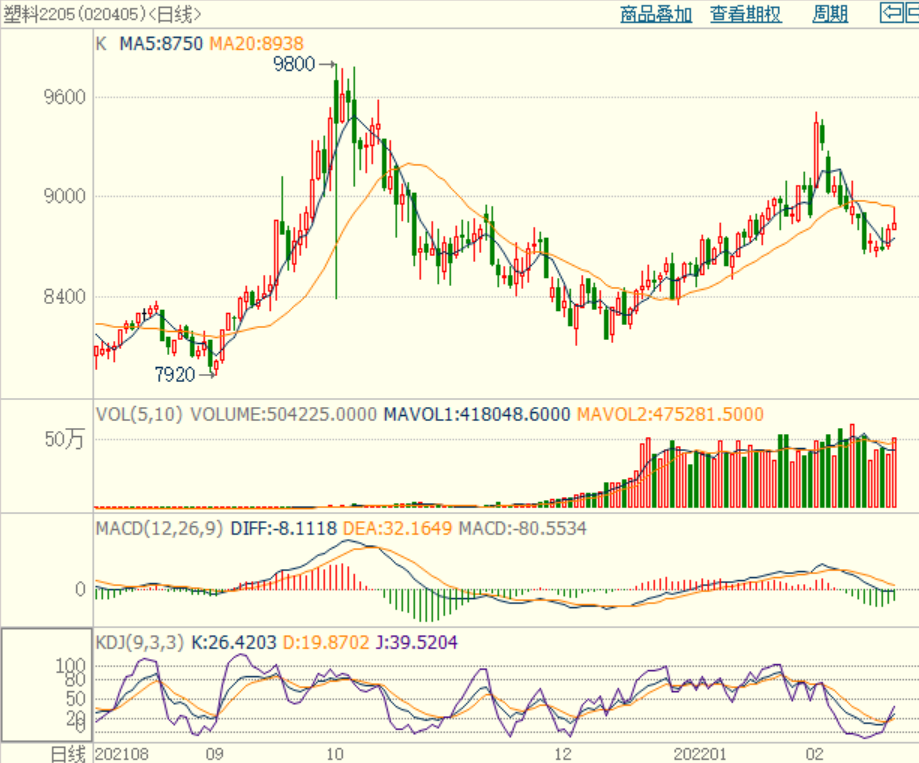 塑料期货05合约冲高后小幅回落,持仓量下降,成交量上升,国际原油大涨,油制LL利润亏损较多,成本支撑较强,不过下游需求恢复缓慢,PE两油及煤化工库存偏高并且消化缓慢,抑制期货涨幅,重点关注原油及PE库存变化,仅供参考。