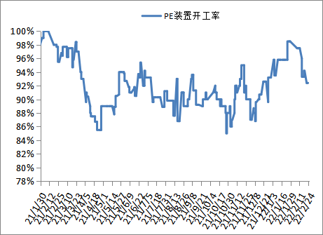 国内PE检修涉及产能在210万吨左右,开工负荷在92.4%左右,日产量在7万吨左右,PE开工负荷虽有下降,但是仍处于偏高水平。国内PE新增大修装置偏少,其中120万吨非计划性检修装置计划2月底开车。