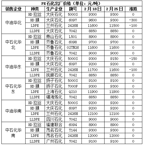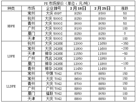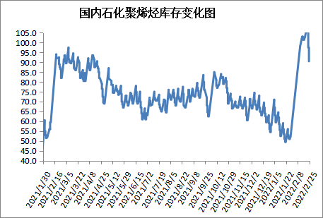 截至2月25日石化聚烯烃库存在90.5万吨,较上周同期下降12.5万吨,国内PE开工负荷下降,进口货源冲击压力偏轻,下游需求逐步上升,尤其是冬奥会结束,华北下游限产结束,开工负荷明显上升,刺激库存下降。下周国内PE部分检修装置计划开车,华北地区部分下游开工负荷可能受冬残奥会影响受限,不利于库存消化。