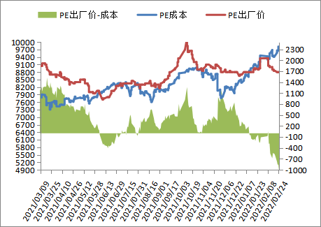 本周PE现货市场报价涨跌互现,国际原油期货大涨,油制LL利润亏损,成本支撑偏强, 不过PE出厂价调涨乏力,甚至部分下调,国内PE装置负荷降幅有限,下游需求恢复缓慢,尤其是塑料期货冲高回落,打压买家购买积极性,周末市场成交气氛转弱。