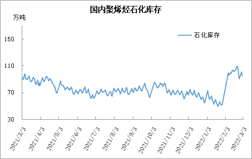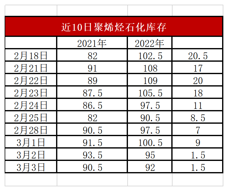 周四石化库存92万吨,较昨天下降3万吨,较去年同期高1.5万吨。春节过后PP库存压力主要集中在中上游,下游库存偏低,有较大补库空间。近期油价带动下市场价格全面走高,下游备货积极性提高,市场成交明显好转,石化去库提速,目前库存已经基本与去年同期持平。
