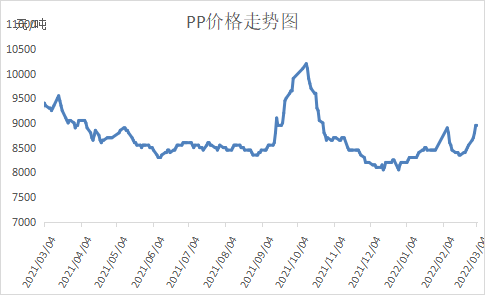 本周PP市场继续上冲,最高触及9000大关。本周PP供需面变化不大,供应压力依然较大,但是需求补库动作明显,石化继续去库,库存压力暂时缓解。本周最大利好来自于成本端,油价暴涨一度逼近120美元大关,动力煤、丙烯等也普遍大涨,成本驱动下PP强势上涨,PP期货最高突破9200大关,现货价格也触及9000元大关。