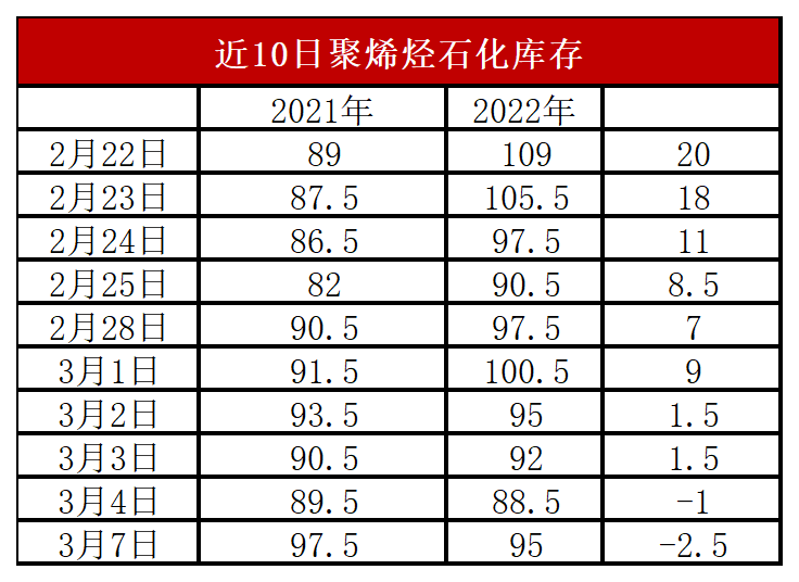 周初石化库存95万吨,较上周末增加6.5万吨,较去年同期低2.5万吨。近期石化快速去库,一度跌破90万吨大关,创出春节后新低,甚至低于去年同期水平。近期石化快速去库得益于行情好转后下游补库增多,市场成交明显好转,石化库存慢慢流入社会库存。后期下游备货力度或减弱,但是考虑后期检修逐渐增多,预计库存维持正常去库水平。