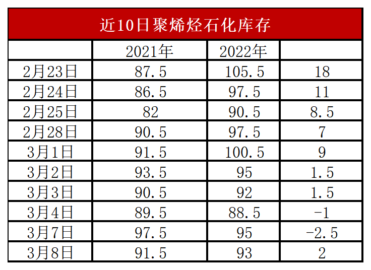 周二石化库存93万吨,较昨天下降2万吨,较去年同期高2万吨。近期石化恢复正常去库,最低一度跌破90万吨大关。近期石化快速去库得益于行情好转后下游补库增多,市场成交明显好转,石化库存慢慢流入社会库存导致社会库存偏高。后期下游维持刚需,考虑后期检修逐渐增多,不过新装置有投产计划,预计库存维持正常去库水平。