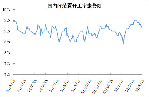 本周PP开工率明显下降。继中石化之后,中石油部分企业也开始因为利润问题降负荷,除此之外徐州海天、三圆石化等也陆续停产,PP开工率明显下降,目前已经降至92%附近。后期PP逐渐进入传统检修季,预计PP开工率有望继续下降并且跌破90%大关。