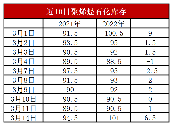 周初石化库存101万吨,较上周末增加10.5万吨,较去年同期高6.5万吨。经历了2月底3月初的快速去库后,近期去库速度有所放缓,周初库存重回100万吨以上。近期虽然检修装置逐渐增多,开工率陆续下降,但是尚未跌破90%,且需求本身是淡季,加之近期疫情影响下终端更加孱弱,抵消供应利好,库存水平再次明显高于去年同期。
