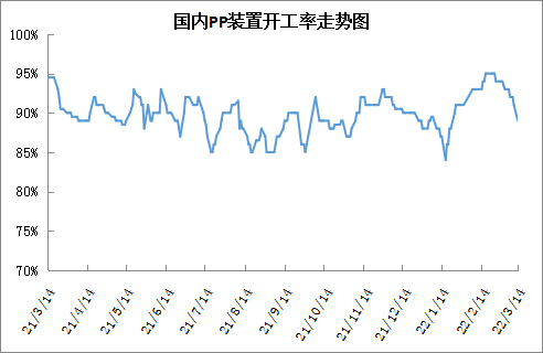 近期PP开工率明显下滑,目前跌破90%大关。近期除了个别装置常规检修之外,多数装置是非常规检修,主要还是因为生产企业亏损而主动降负荷,尤其是近期两桶油降负荷逐渐落地,开工率下降明显,后期有望继续下降。