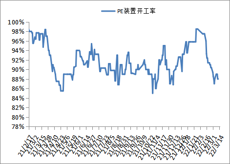 国内PE检修涉及产能在110万吨左右,部分装置因利润亏损,开工负荷有所下降,目前国内PE开工负荷在88%左右,日产量在6.65万吨左右,据悉后期开工负荷仍有下降风险。