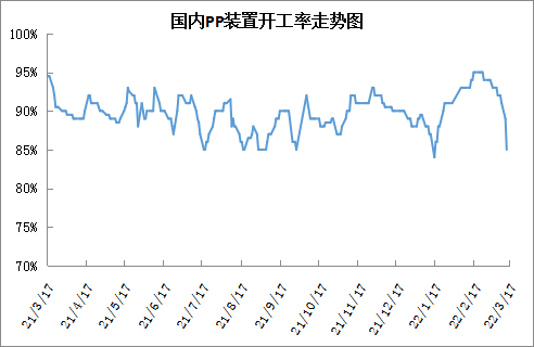 近期PP开工率明显下滑,目前已经跌至85%附近。近期除了个别装置常规检修之外,多数装置是非常规检修,主要还是因为生产企业亏损而主动降负荷,尤其是近期两桶油降负荷逐渐落地,开工率下降明显,后期有望继续下降。