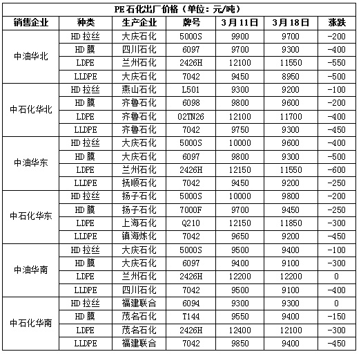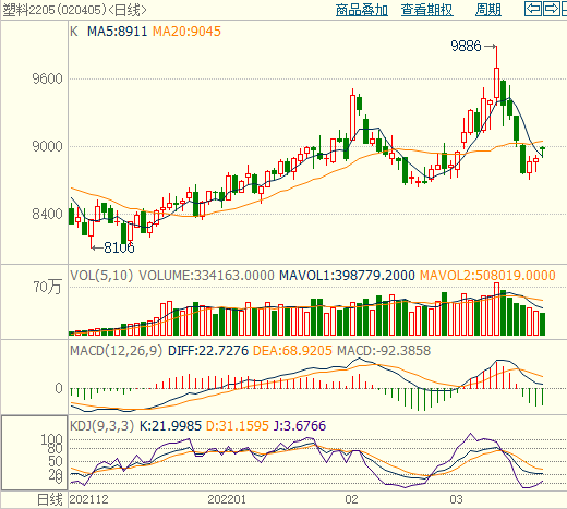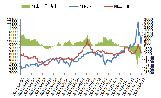 本周PE现货市场报价较上周大幅下跌,国际油价先跌后涨,但是较上周末仍有下降,PE生产企业利润亏损,装置负荷下降,但是疫情升级影响下游开工,PE两油及煤化工库存高企难下,PE出厂价回调,拖累塑料期货走弱,打压买家购买积极性,市场成交气氛一般。