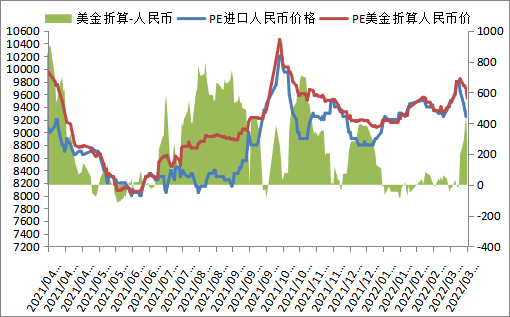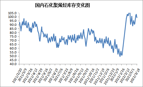 截至3月18日石化聚烯烃库存在99万吨,较上周同期上升7.5万吨,尽管国内PE开工负荷下降4%,进口货源冲击压力偏轻,但是疫情升级影响下游开工,导致库存上升。