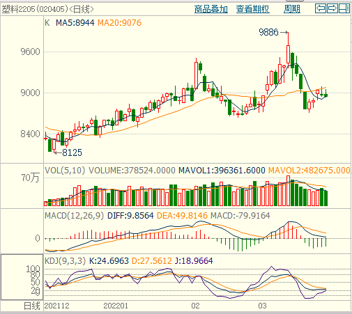 塑料期货05合约冲高回落,持仓量减少成交量同步上升,盘面收上影十字星,国际原油大涨刺激期货反弹,不过近期疫情升级影响下游开工,两油及煤化工库存上升,抑制期货涨幅,预计近期塑料期货偏震荡运行,仅供参考。