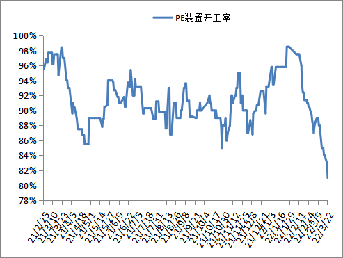 国内PE检修涉及产能增加至290万吨左右,而且部分装置因利润亏损,开工负荷有所下降,目前国内PE开工负荷下降至81%左右,日产量在6.12万吨左右,据悉后期开工负荷仍有下降风险。