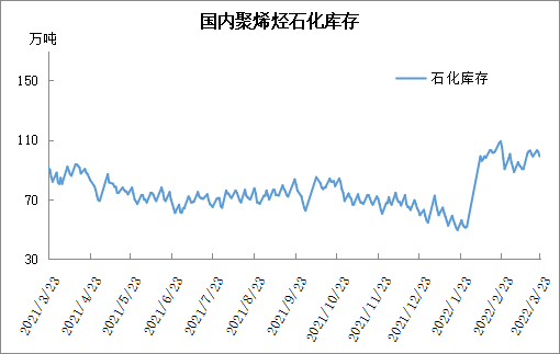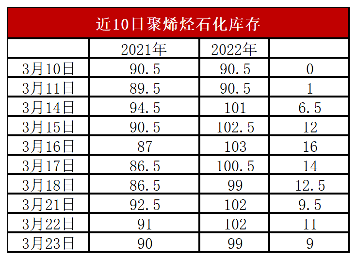 周三石化库存99万吨,较昨天下降3万吨,较去年同期高10万吨左右。目前是聚烯烃传统淡季,需求偏弱,加之疫情影响需求雪上加霜,物流运转受限,石化库存维持高位。不过近期检修装置也明显增多,聚烯烃开工率大幅下降,供应压力明显缓解,加之部分地区疫情控制,需求逐渐恢复,石化去库略有提速。