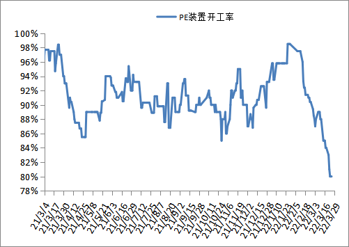 国内PE检修涉及产能在280万吨左右,而且部分装置因利润亏损,开工负荷有所下降,目前国内PE开工负荷下降至80%左右,日产量在6.05万吨左右,据悉后期开工负荷仍有下降风险。