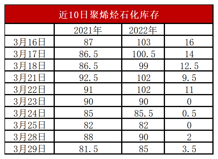 周二石化库存85万吨,较昨天下降5万吨,较去年同期高3.5万吨。近期石化去库恢复到正常水平,主要因为上游检修装置增多,开工率大幅下降,目前聚烯烃平均开工率在90%以下,大大缓解供应压力。不过下游需求整体低迷,疫情影响终端需求以及物流运输,石化去库仅能维持正常水平,难以低于往年同期水平。