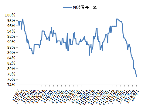 国内PE检修涉及产能在290万吨左右,而且部分装置因利润亏损,开工负荷有所下降,目前国内PE开工负荷下降至77%左右,日产量在5.82万吨左右,据悉后期开工负荷仍有下降风险。