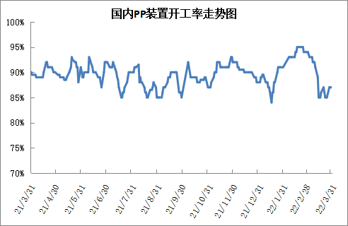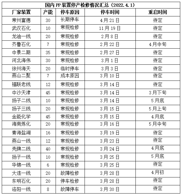 PP上游企业普遍亏损的背景,尤其是油头PP亏损最为明显,两桶油开始主动减产应对亏损情况。从3月份开始,两桶油多家企业或直接停产,或降负荷,此外部分外采装置如海天石化等也纷纷停工,PP开工率大幅下降。目前PP开工率已经降至85%附近。4月份两桶油继续执行降负保价政策,而目前也是PP传统检修期,预计后期PP开工率有望继续维持低位。