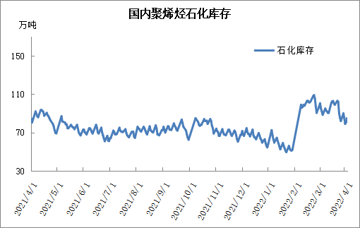 近期石化去库整体较快,已经低于去年同期水平,近两天累库主要因为月底石化停销结算。近期去库提速,主要因为上游检修装置增多,开工率大幅下降,目前聚烯烃平均开工率在85%以下,大大缓解供应压力。不过近期南方地区疫情形势严峻,部分下游有停工迹象,加之清明小长假来临,预计节后库存压力增加。