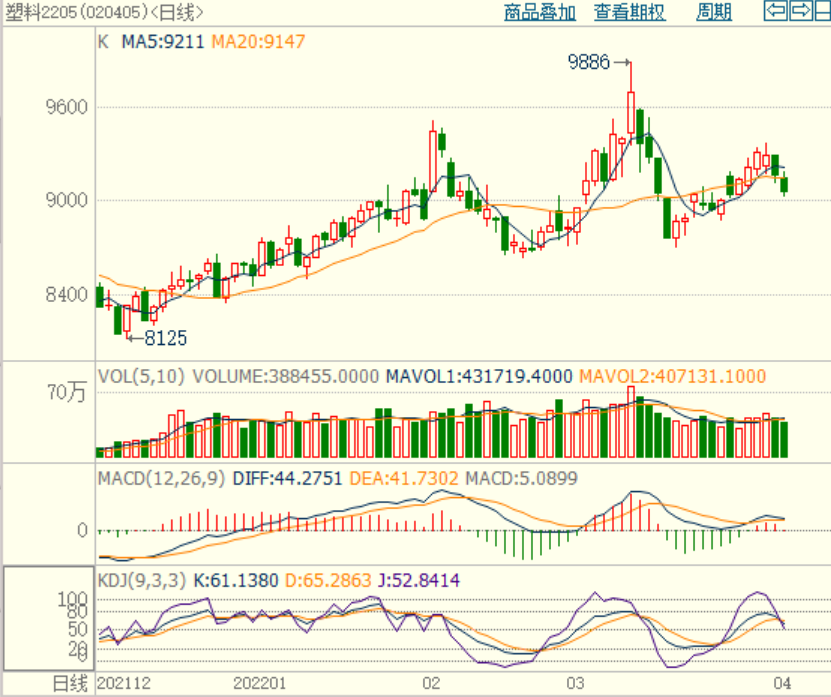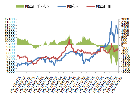 本周PE现货市场报价震荡上涨,PE生产企业利润亏损产量下降,PE出厂价部分上调,贸易商高报出货,不过疫情影响物流运输,下游需求恢复缓慢,周末国际油价走弱,拖累塑料期货下跌,打压买家购买积极性,抑制现货市场涨幅,市场成交气氛一般。