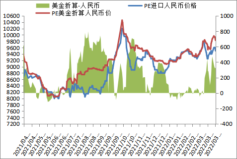 本周PE进口线性美金主流报价上升至1250-1280,折算人民币成本在9750-10000,市场主流9450-9500,进口线性利润维持亏损,部分进口LL低端报价9250左右,高国产线性价格150左右,LL进口窗口维持关闭。