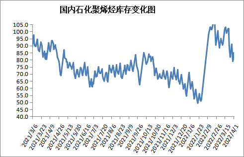 截至4月1日石化聚烯烃库存在85万吨,较上周同期上升3万吨,国内PE生产企业利润亏损产量下降,进口货源冲击压力偏轻,不过疫情影响物流运输,导致库存上升,待国内疫情好转,下游需求预期上升,库存仍有下降机会。