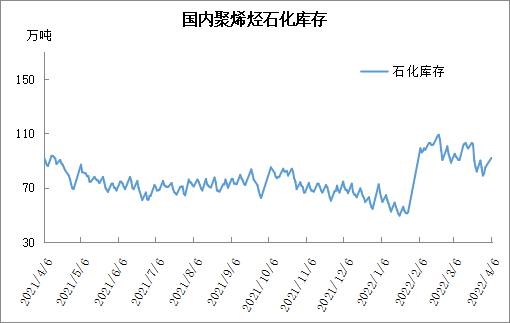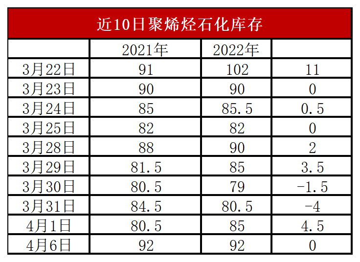 清明节后首日石化库存92万吨,较上周五增加7万吨,与去年同期持平。节前石化去库正常,库存水平甚至一度低于去年同期,主要因为目前进入聚烯烃传统集中检修期,且两桶油等上游企业因为亏损而主动降负保价,导致聚烯烃开工率偏低,供应压力明显缓解。不过需求端偏弱,尤其是近期疫情形势严峻,终端需求雪上加霜,导致去库并未进一步提速。