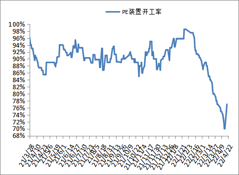 国内PE开工负荷在77%左右,日产量在5.9万吨左右,近期新增检修装置偏少,部分检修装置陆续计划开车,国内PE开工负荷仍有上升预期,5月份仍有新增大修计划,预计产量会有下降。