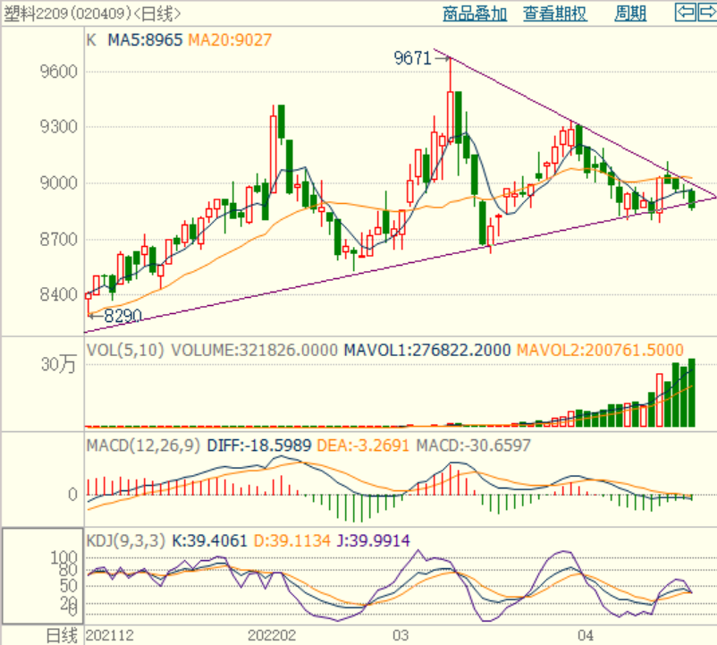 塑料期货09合约维持下跌行情,国际油价走弱,疫情拖累下游需求表现疲软,PE生产企业产量上升,PE两油及煤化工库存下降缓慢,拖累塑料期货走弱,不过待疫情好转后,下游需求有修复预期,预计塑料期货仍有反弹机会,仅供参考。